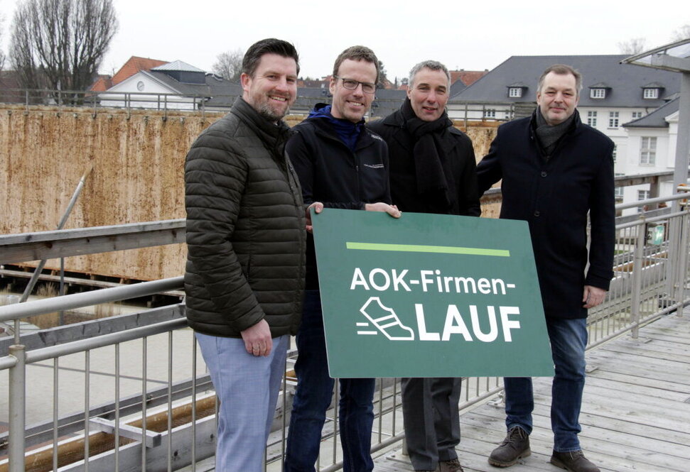 Startklar für den 13. AOK-Firmenlauf Lippe am 12. Mai: (v.l.) Matthias Wehmhöner (AOK-Serviceregionsleiter), Bernd Weber (Veranstalter vom Laufladen Endspurt) Dirk Tolkemitt (Bürgermeister der Stadt Bad Salzuflen) und Oliver Siekmann (Stadtmarketing Stadt Bad Salzuflen). Foto: AOK/hfr