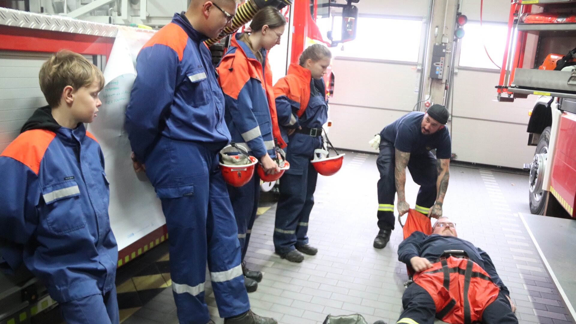 Einen ganzen Tag lang quartierten sich die Jugendlichen im Alter zwischen zehn und 17 Jahren im Gerätehaus an der Robert-Hanning-Straße ein. Zum Schlafen standen Feldbetten in den Schulungsräumen bereit. Paula (11) nahm zum ersten Mal dabei. Seit einem Jahr gehört sie der Jugendwehr an und nimmt jeden zweiten Mittwoch am Übungsabend teil. „Das ist schon cool, was wir dort machen“, sagte sie. „Aber ich habe noch keine Vorstellung, was bei einem Verkehrsunfall oder bei einem Brand zu tun ist.“ Phil (14) trat vor vier Jahren der Jugendwehr bei, weil ihn vor allem die technischen Dinge interessieren. Er hat schon mal an einem 24-Stunden-Dienst teilgenommen. „Das hat sehr viel Spaß gemacht, außerdem kann man viel lernen, wenn man den ganzen Tag zusammen ist.“