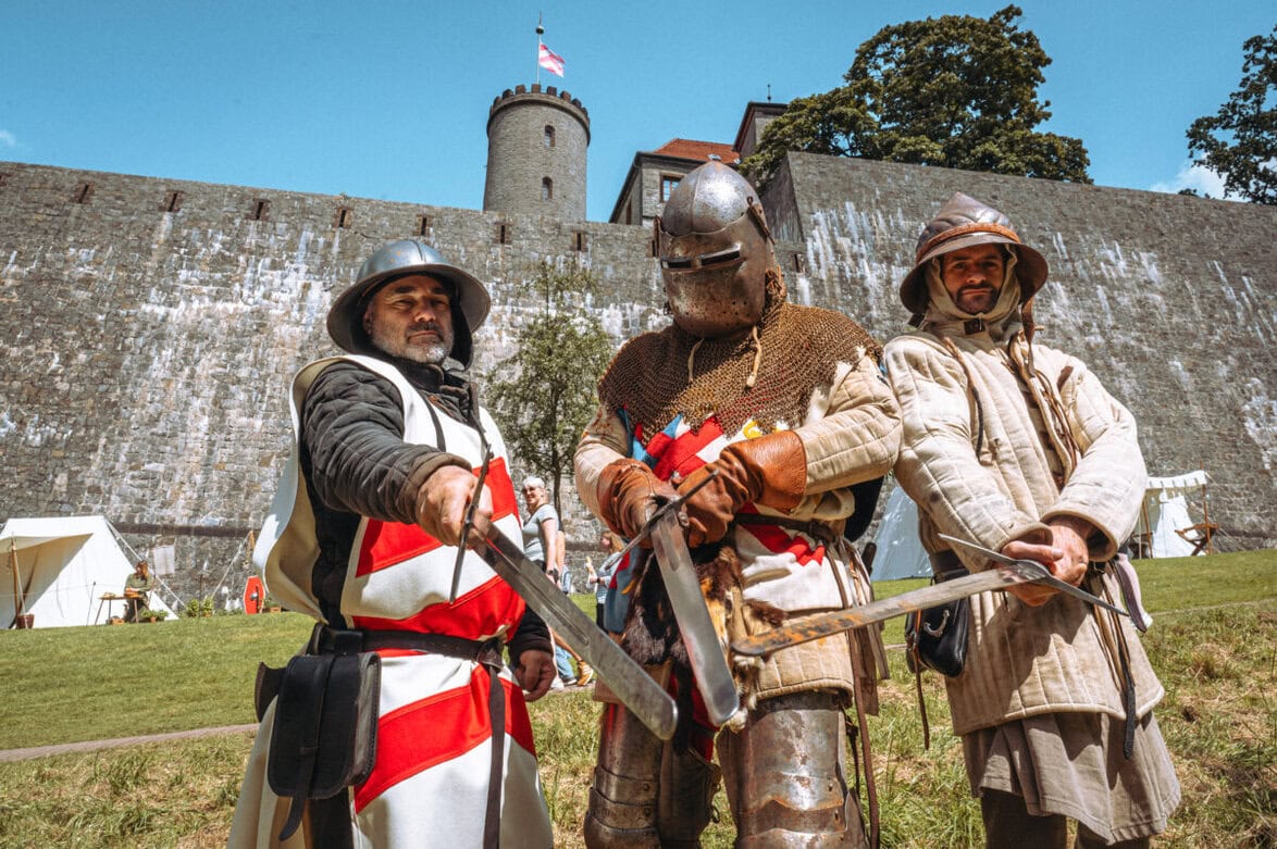 Mit allen Sinnen ins Mittelalter abtauchen: Wenn Klänge von Dudelsäcken ertönen, der Duft von Anis und Weihrauch in die Nase zieht, das ofenfrische Fladenbrot im Munde zergeht und der Blick auf edle Ritter in prächtiger Rüstung fällt – dann ist Sparrenburgfest in Bielefeld.