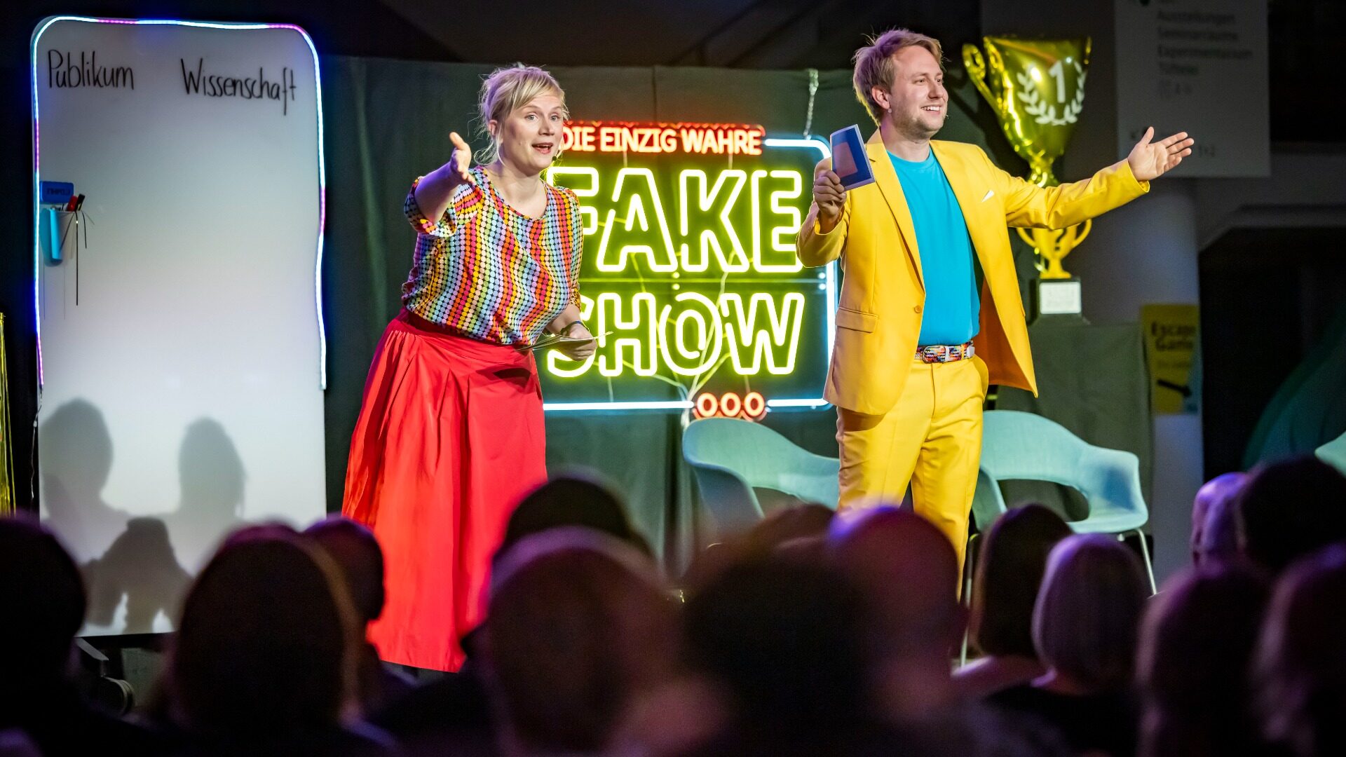 „Moderiert wird die Show vom eingespielten Duo Nele Kießling und Marvin Meinold, die mit Witz, Charme und einer Prise Fernsehnostalgie durch den Abend führen.“ Foto: Wissenswerkstadt, Sarah Jonek