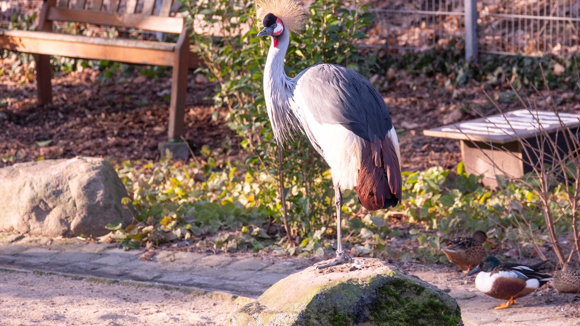 Der nun ausgezeichnete Kronenkranich stammt ursprünglich aus Afrika und besticht durch seine namensgebende, strohgelbe Federkrone sowie das blaugraue Gefieder. Sein Mitbewohner, der Jungfernkranich, ist die kleinste Kranichart und zeichnet sich durch ein hellgraues Federkleid aus. Obwohl sein Verbreitungsgebiet von Südeuropa bis in die Mongolei reicht, ist auch er bedroht – vor allem durch die Trockenlegung von Sümpfen, die als unverzichtbare Brutrefugien dienen.
