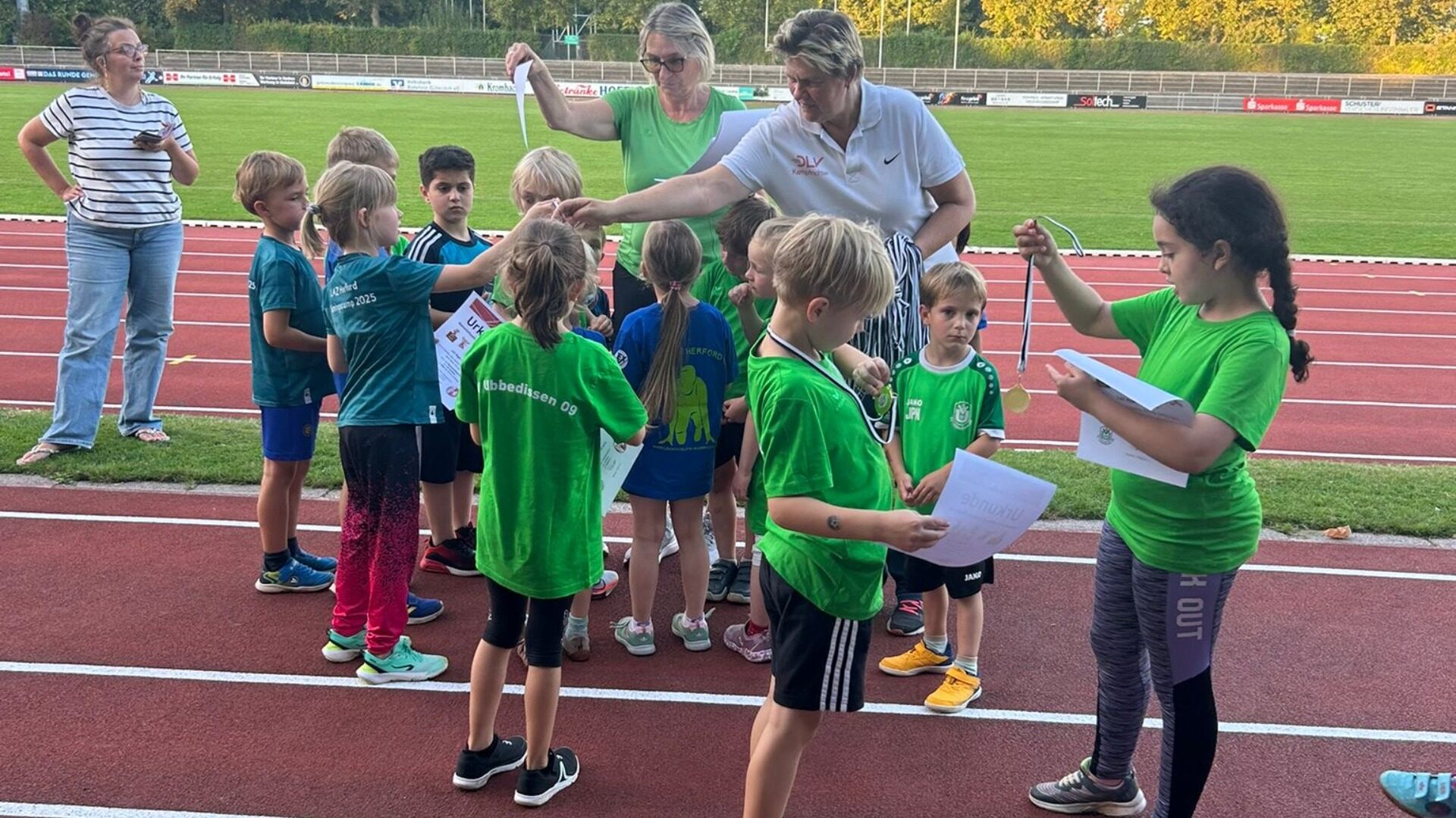 2 Mannschaften konnten wir bei den U 8 Startern melden. Mit Melissa, Saja, Ole, Emilia, Milana und Amila landeten wir auf dem 1. Platz. Auf Platz 2 kam das Team aus Herford und der 3. Platz mit Hanno, Azlan, Ole, Nick, Simon, Mina, Julius und Mattis ging wieder nach Ubbedissen. Allen Kindern hat es viel Spaß bereitet und mit vollem Eifer wurden die Disziplinen bewältigt. Alle Teilnehmer bekamen eine Urkunde und eine Medaille zur Erinnerung.