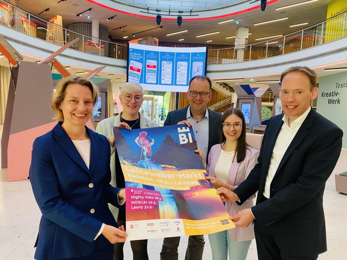 Jennifer Erdmann (l.) und Dr. Jörn Stöppel (r.) von der Sparkasse Bielefeld und Katharina Schilberg, Martin Knabenreich und Leonie Klau (v. l.) von Bielefeld Marketing präsentieren die Top-Acts und das gesamte Programm für das beliebte Stadtfest in der Bielefelder Innenstadt. Foto:© Bielefeld Marketing GmbH