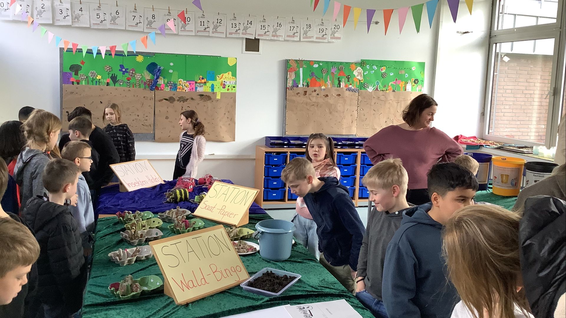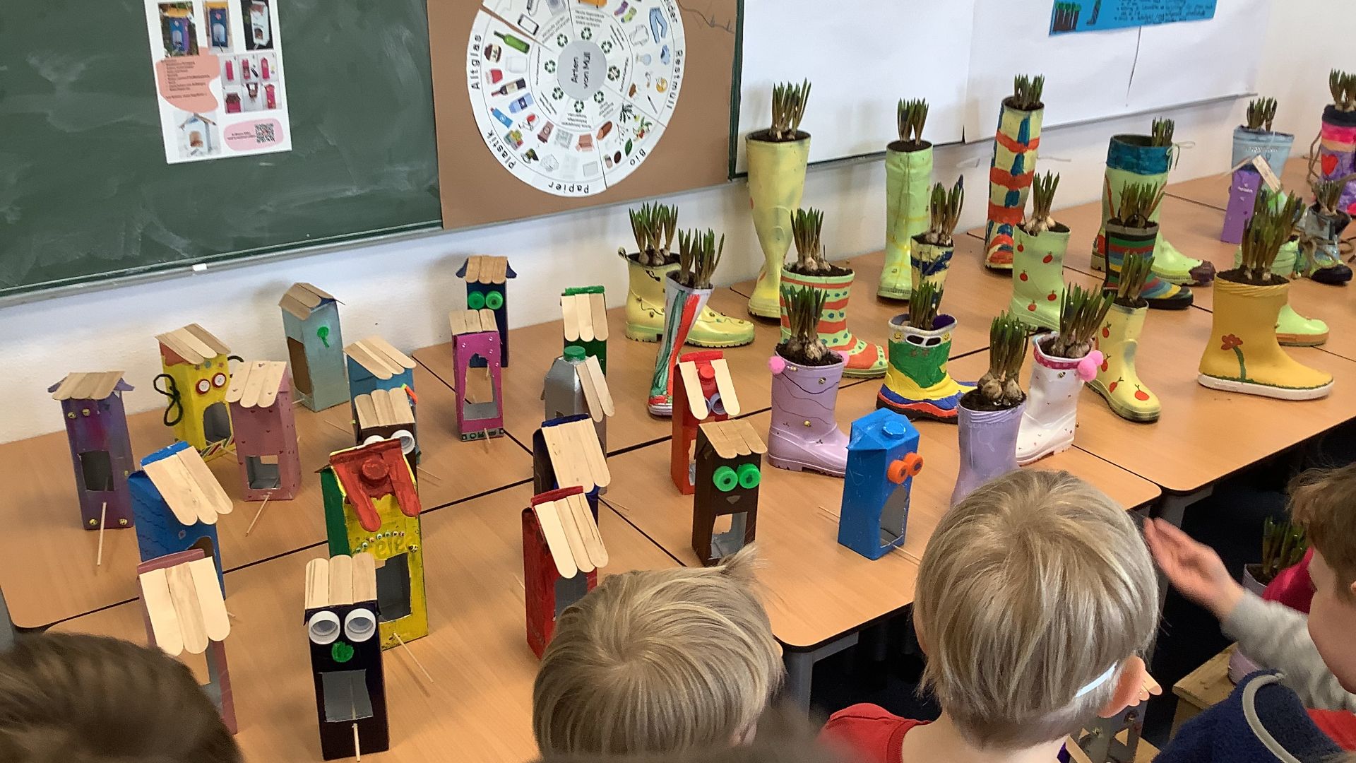 Die Viertklässler widmeten sich dem Upcycling. Sie verwandelten alte Dinge wie Milchtüten oder Gummistiefel in neue, nützliche Objekte wie Vogelhäuser oder Blumengefäße. Dabei standen handwerkliches Geschick, Design und Haltbarkeit im Fokus. Ein bunter Parcours zeigte, dass Wertstoffe mehr sind als nur Müll.