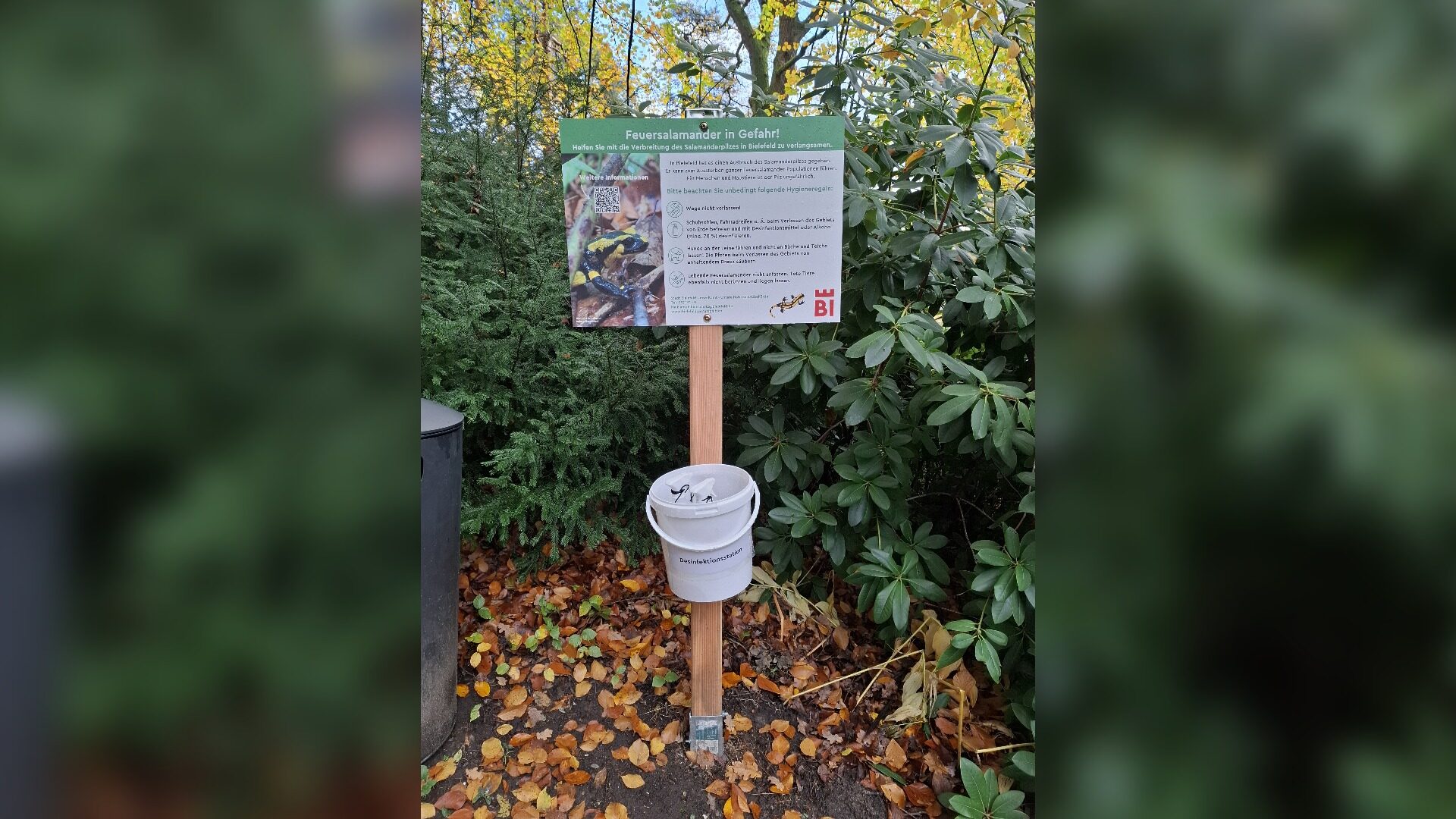 Diese Schilder sollen die Besucherinnen und Besucher über die Salamanderpest informieren und Hinweise zu den wichtigsten Verhaltensweisen geben. Darüber hinaus werden Desinfektionsstationen an den Eingängen eingerichtet, an denen Schuhe gereinigt werden können. So soll verhindert werden, dass Bsal-Sporen ungewollt verbreitet werden – etwa durch Erdreste an Schuhsohlen. Der Pilz, der insbesondere Feuersalamander befällt, greift die empfindliche Haut der Tiere an und führt zu schweren Hautläsionen. Dies verläuft für die Feuersalamander meist innerhalb weniger Tage tödlich. Für den Menschen ist der Pilz hingegen ungefährlich.