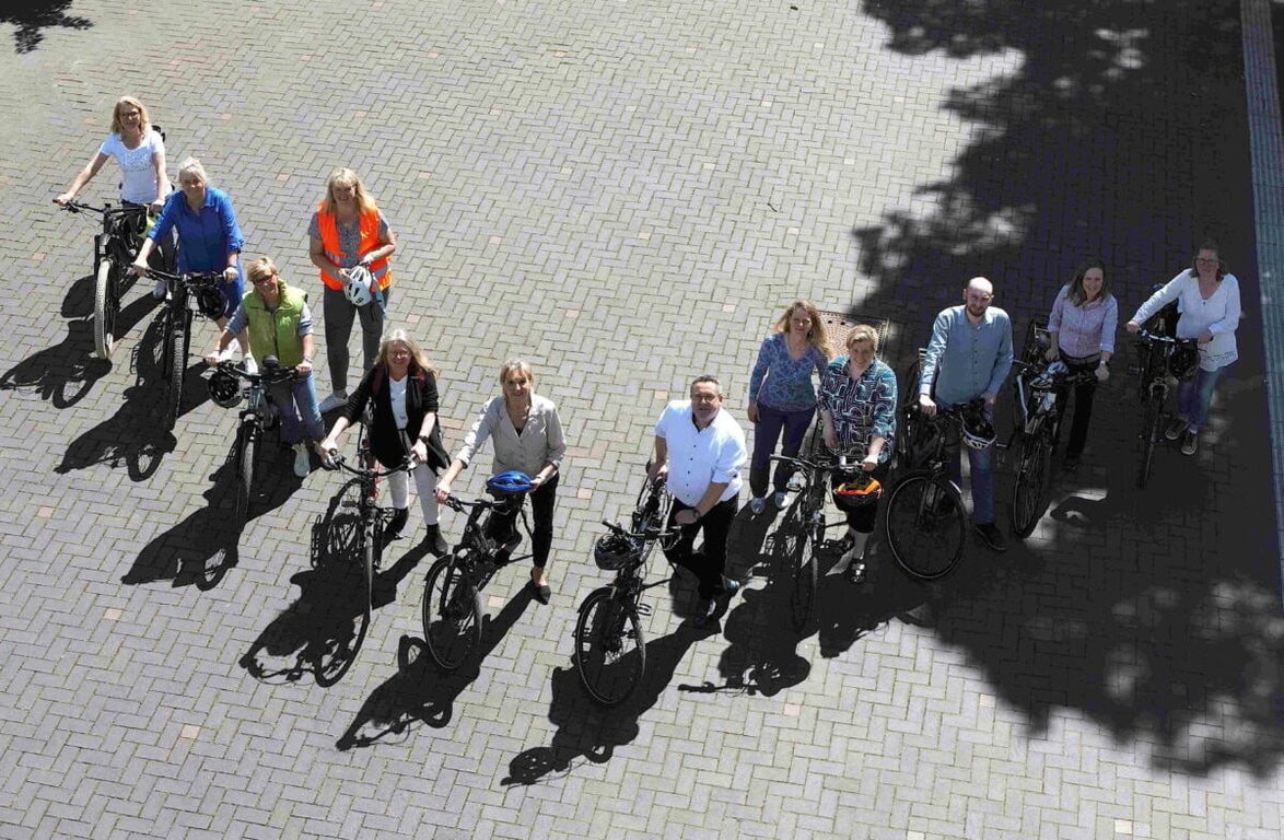 (ab 3. v.r.): Christian Bange (stellvertretender Radverkehrsbeauftragte des Kreises Lippe), Anna-Lena Mügge (Radverkehrsbeauftragte des Kreises Lippe), Landrat Dr. Axel Lehmann und Dr. Ute Röder (Verwaltungsvorständin des Kreises Lippe) freuen sich gemeinsam mit den Mitarbeitenden des Kreises auf das diesjährige STADTRADELN. Foto: Kreis Lippe