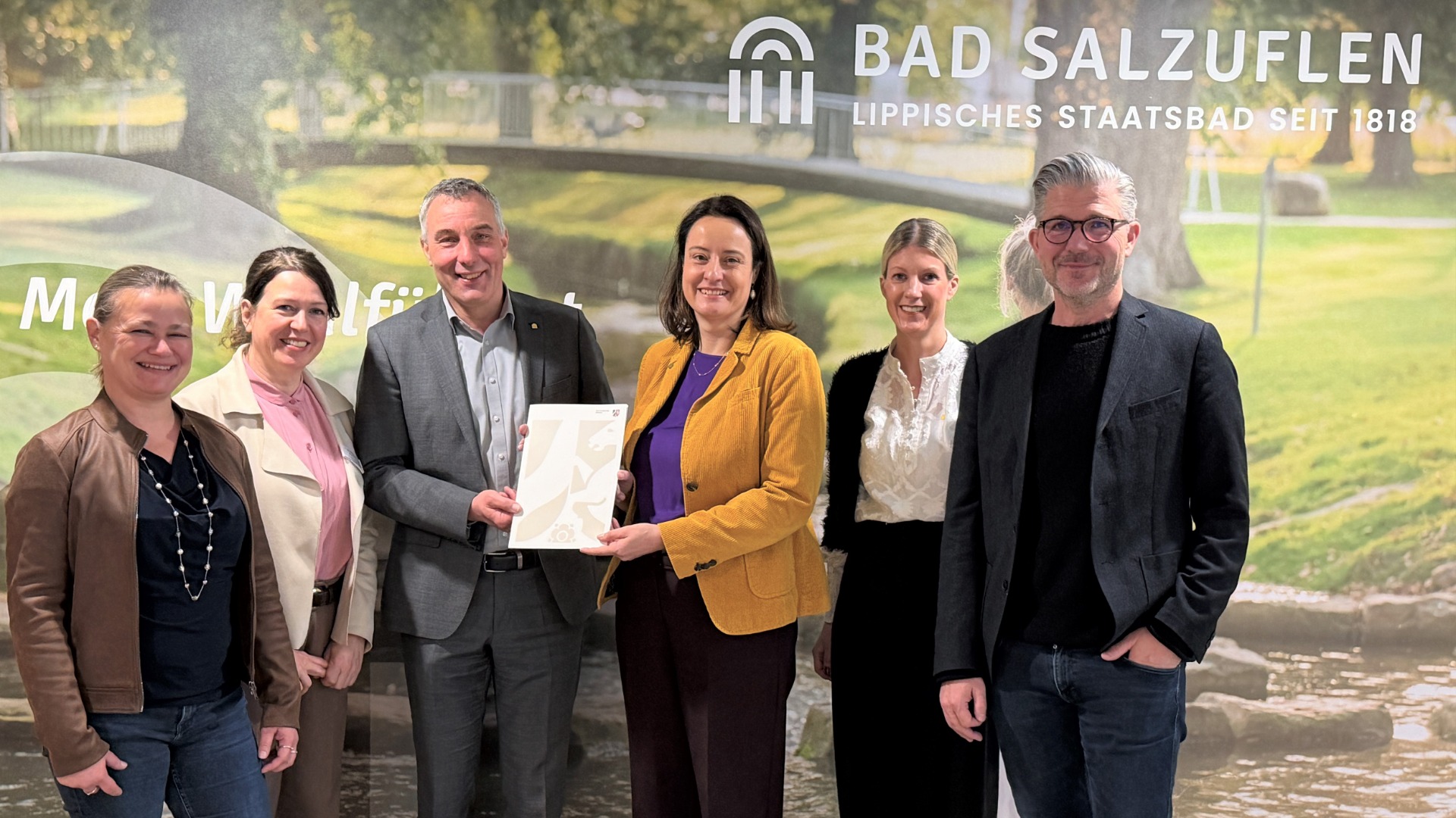 Neuer Meilenstein für die touristische Weiterentwicklung in Bad Salzuflen: Regierungspräsidentin Anna Katharina Bölling (3.v.r.) übergab den Förderbescheid für das Zukunftsprojekt „Erlebniswelt Kneipp“ im Landschaftsgarten an Bürgermeister Dirk Tolkemitt (3.v.l.), Melanie Koring (2.v.r.), Ulrike Niebuhr (links), Ralf Hammacher (rechts,) und Katja Mönnigmann-Steinbeck (2.v.l). Foto: © Stadt Bad Salzuflen