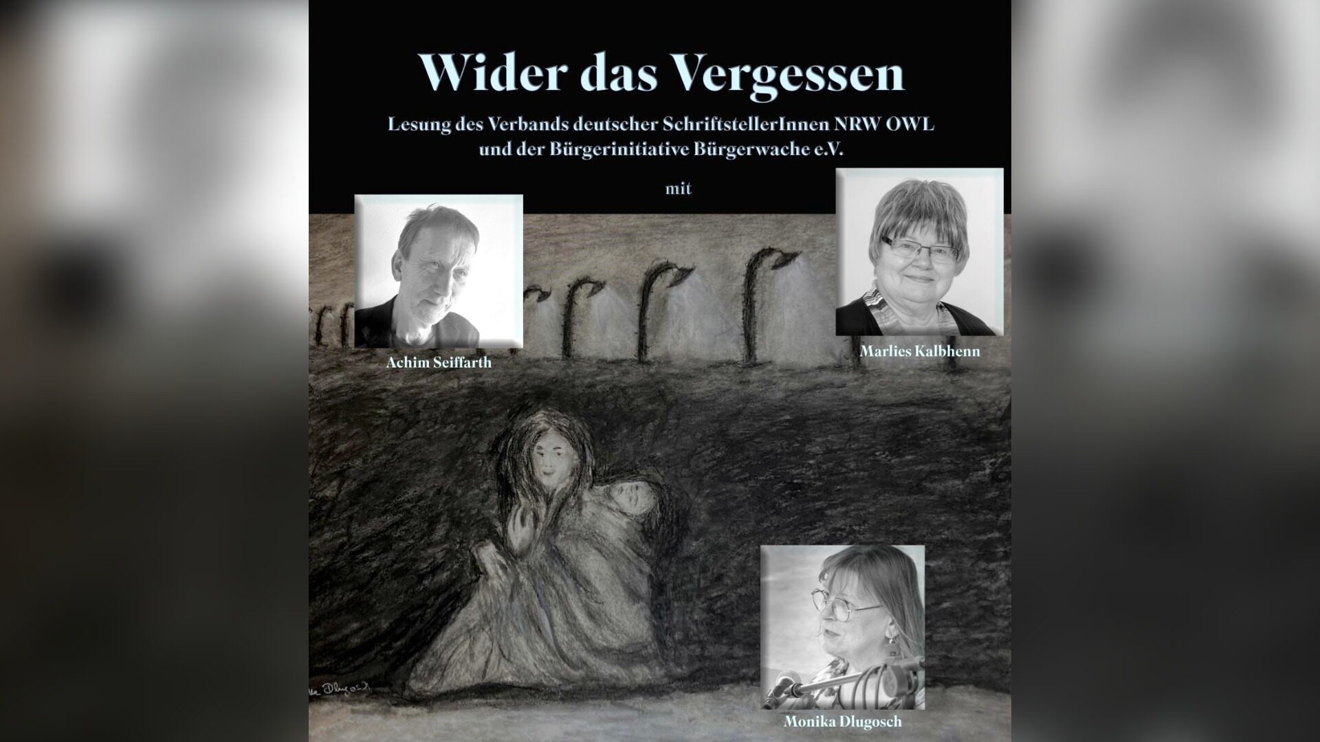 Lesung „Wider das Vergessen“, Datum: Donnerstag, den 13.11.2025. Uhrzeit: 19.00 Uhr (Einlass: 18.30 Uhr). Ort: Saal (Raum 007, EG), Bürgerinitiative Bürgerwache e.V., Rolandstraße 16, 33615 Bielefeld. Eintritt: Frei. Kontakt: Tel. 0521-132737, Web: www.bi-buergerwache.de