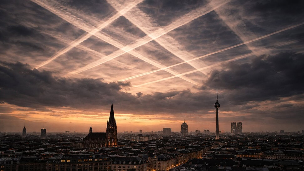 Das sogenannte Schachbrettmuster am Himmel entsteht, wenn sich langlebige Kondensstreifen entlang fester Flugrouten überkreuzen. Begünstigt wird dies durch feuchte, ruhige Luftschichten in großer Höhe – ein Zusammenspiel aus Wetterlage und Luftverkehr, kein gezielter Eingriff.